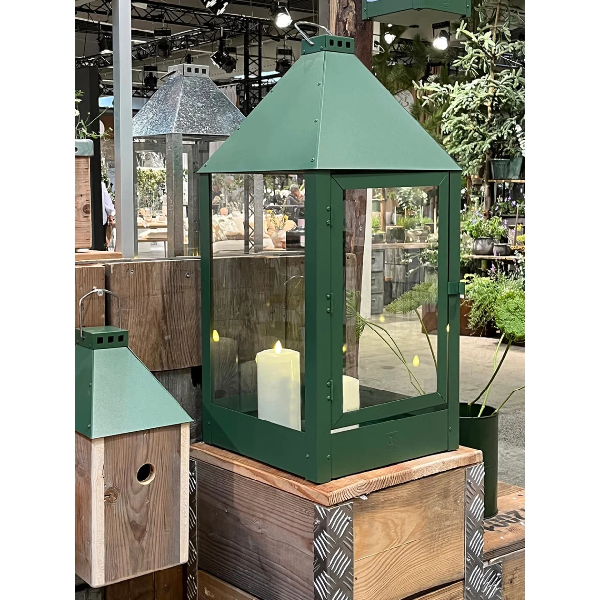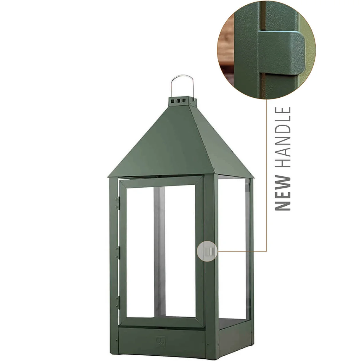 A2 Living's velkendte galvaniserede/olivengrønlakerede helårslanterne med nem, brugervenlig magnet-luk.
